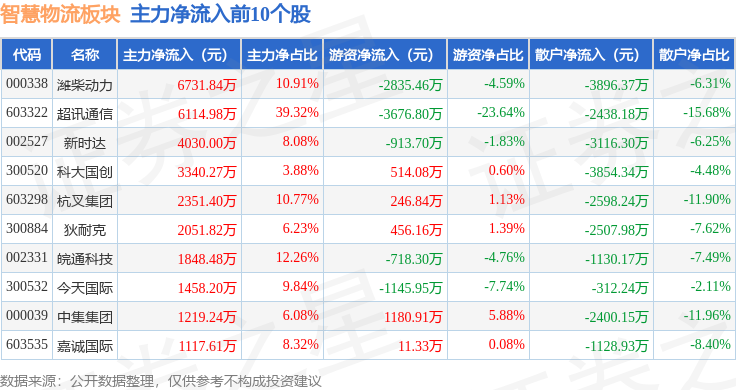 从资金流向上来看,当日智慧物流板块主力资金净流出4.57亿元,游资资金净流出2.72亿元,散户资金净流入7.29亿元。智慧物流板块个股资金流向见下表: