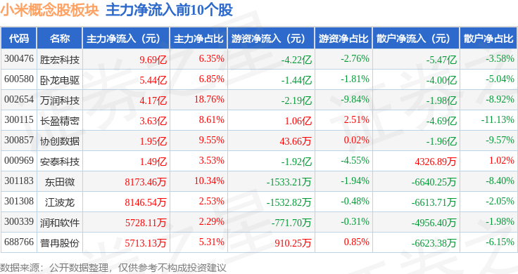 从资金流向上来看,当日小米概念股板块主力资金净流入7.43亿元,游资资金净流出13.74亿元,散户资金净流入6.31亿元。小米概念股板块个股资金流向见下表: