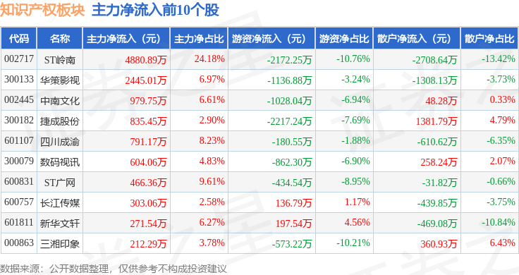从资金流向上来看,当日知识产权板块主力资金净流出8398.24万元,游资资金净流出1.39亿元,散户资金净流入2.23亿元。知识产权板块个股资金流向见下表: