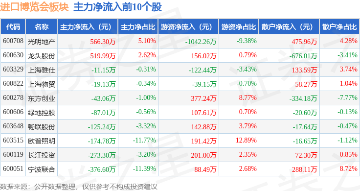 从资金流向上来看,当日进口博览会板块主力资金净流出2944.22万元,游资资金净流入202.56万元,散户资金净流入2741.66万元。进口博览会板块个股资金流向见下表: