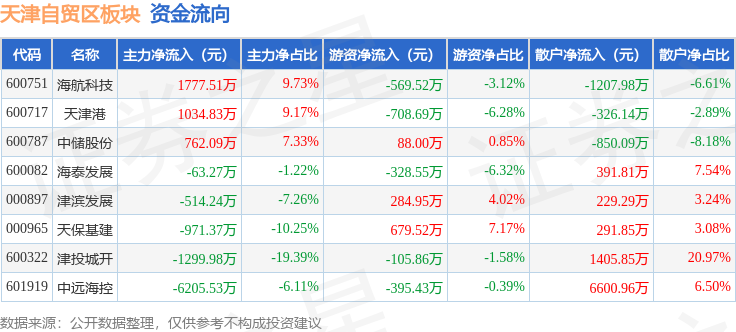 从资金流向上来看,当日天津自贸区板块主力资金净流出5479.97万元,游资资金净流出1055.58万元,散户资金净流入6535.56万元。天津自贸区板块个股资金流向见下表: