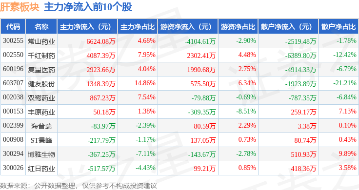 从资金流向上来看,当日肝素板块主力资金净流出987.47万元,游资资金净流入6229.75万元,散户资金净流出5242.28万元。肝素板块个股资金流向见下表: