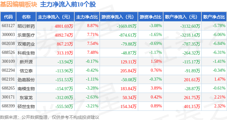 从资金流向上来看,当日基因编辑板块主力资金净流入6293.87万元,游资资金净流入3459.78万元,散户资金净流出9753.64万元。基因编辑板块个股资金流向见下表:
