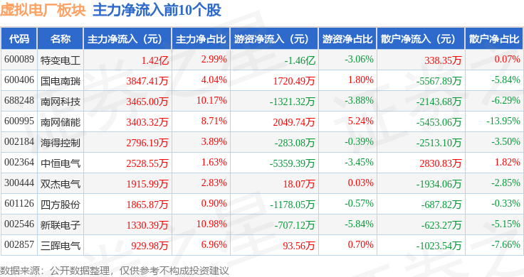 从资金流向上来看,当日虚拟电厂板块主力资金净流出6.36亿元,游资资金净流出1.23亿元,散户资金净流入7.59亿元。虚拟电厂板块个股资金流向见下表: