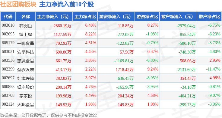 从资金流向上来看,当日社区团购板块主力资金净流出2.18亿元,游资资金净流入3085.3万元,散户资金净流入1.88亿元。社区团购板块个股资金流向见下表:
