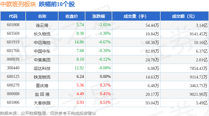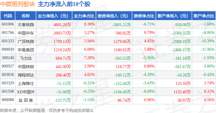 从资金流向上来看,当日中欧班列板块主力资金净流出7080.82万元,游资资金净流出2902.04万元,散户资金净流入9982.86万元。中欧班列板块个股资金流向见下表: