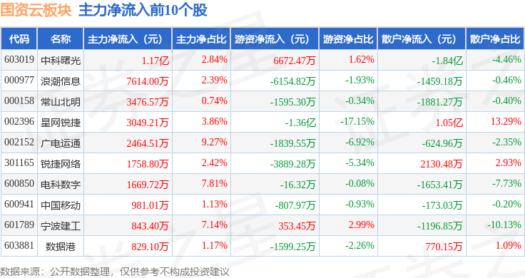 从资金流向上来看,当日国资云板块主力资金净流出4.0亿元,游资资金净流出2.63亿元,散户资金净流入6.63亿元。国资云板块个股资金流向见下表: