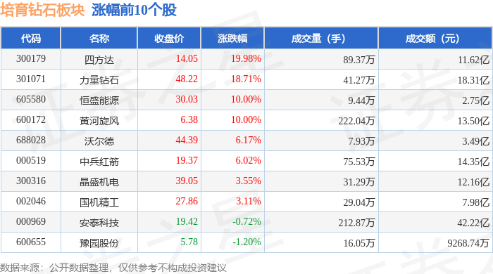 证券之星消息,10月20日培育钻石板块较上一交易日上涨3.4%,四方达领涨。当日上证指数报收于3863.89,上涨0.63%。深证成指报收于12813.21,上涨0.98%。培育钻石板块个股涨跌见下表: