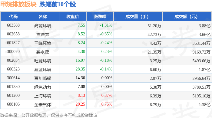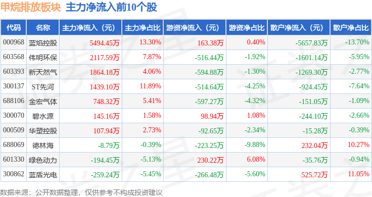 从资金流向上来看,当日甲烷排放板块主力资金净流入1357.29万元,游资资金净流入927.15万元,散户资金净流出2284.45万元。甲烷排放板块个股资金流向见下表:
