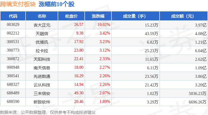 证券之星消息,10月20日跨境支付板块较上一交易日上涨0.57%,吉大正元领涨。当日上证指数报收于3863.89,上涨0.63%。深证成指报收于12813.21,上涨0.98%。跨境支付板块个股涨跌见下表: