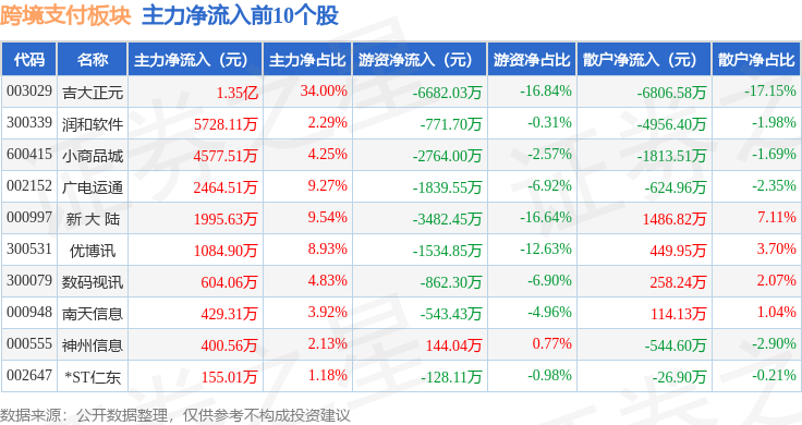从资金流向上来看,当日跨境支付板块主力资金净流出3.95亿元,游资资金净流出1.8亿元,散户资金净流入5.75亿元。跨境支付板块个股资金流向见下表: