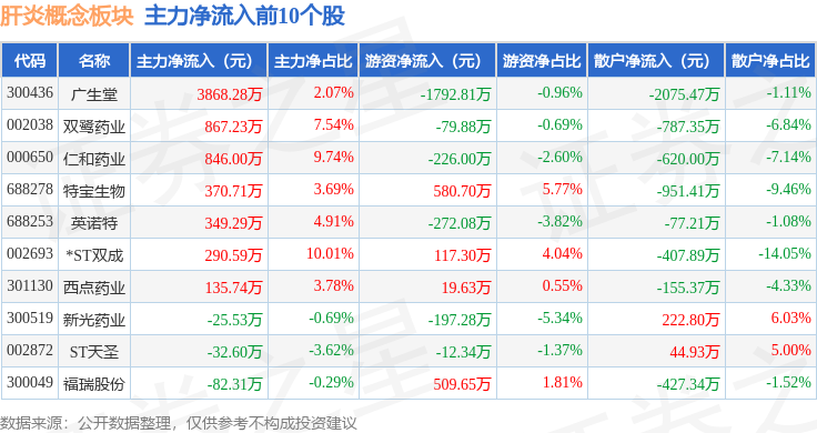 从资金流向上来看,当日肝炎概念板块主力资金净流出2.56亿元,游资资金净流入4452.33万元,散户资金净流入2.11亿元。肝炎概念板块个股资金流向见下表: