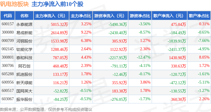从资金流向上来看,当日钒电池板块主力资金净流出1.84亿元,游资资金净流入299.23万元,散户资金净流入1.81亿元。钒电池板块个股资金流向见下表: