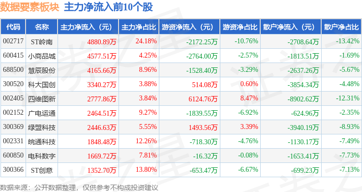 从资金流向上来看,当日数据要素板块主力资金净流出7.9亿元,游资资金净流出1.88亿元,散户资金净流入9.77亿元。数据要素板块个股资金流向见下表: