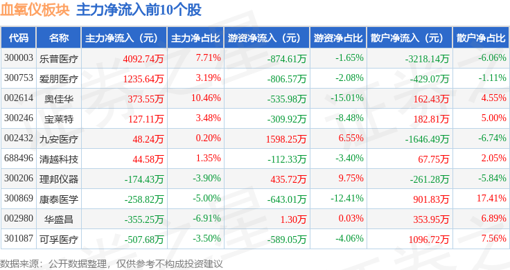 从资金流向上来看,当日血氧仪板块主力资金净流出27.59万元,游资资金净流出1382.58万元,散户资金净流入1410.17万元。血氧仪板块个股资金流向见下表: