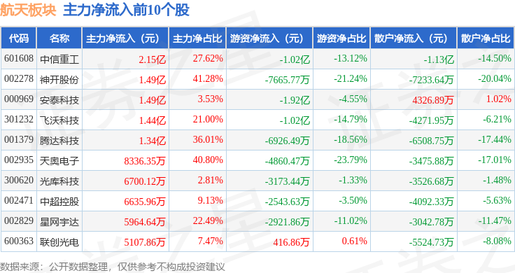 从资金流向上来看,当日航天板块主力资金净流入2.27亿元,游资资金净流出7.88亿元,散户资金净流入5.62亿元。航天板块个股资金流向见下表: