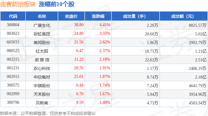证券之星消息,10月20日虫害防治板块较上一交易日上涨0.37%,广康生化领涨。当日上证指数报收于3863.89,上涨0.63%。深证成指报收于12813.21,上涨0.98%。虫害防治板块个股涨跌见下表: