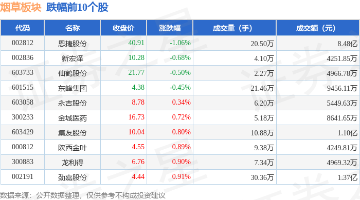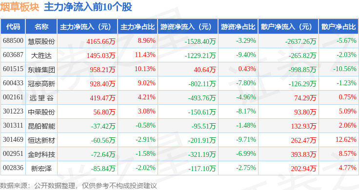 从资金流向上来看,当日烟草板块主力资金净流出8365.74万元,游资资金净流出3315.75万元,散户资金净流入1.17亿元。烟草板块个股资金流向见下表: