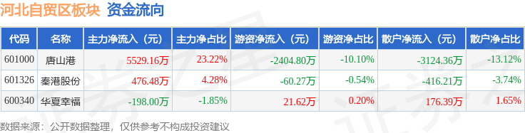 从资金流向上来看,当日河北自贸区板块主力资金净流入5807.63万元,游资资金净流出2443.45万元,散户资金净流出3364.18万元。河北自贸区板块个股资金流向见下表: