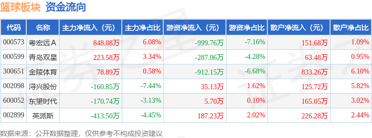 从资金流向上来看,当日篮球板块主力资金净流入405.45万元,游资资金净流出1970.92万元,散户资金净流入1565.47万元。篮球板块个股资金流向见下表: