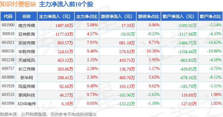 从资金流向上来看,当日知识付费板块主力资金净流出5476.13万元,游资资金净流入3983.23万元,散户资金净流入1492.9万元。知识付费板块个股资金流向见下表: