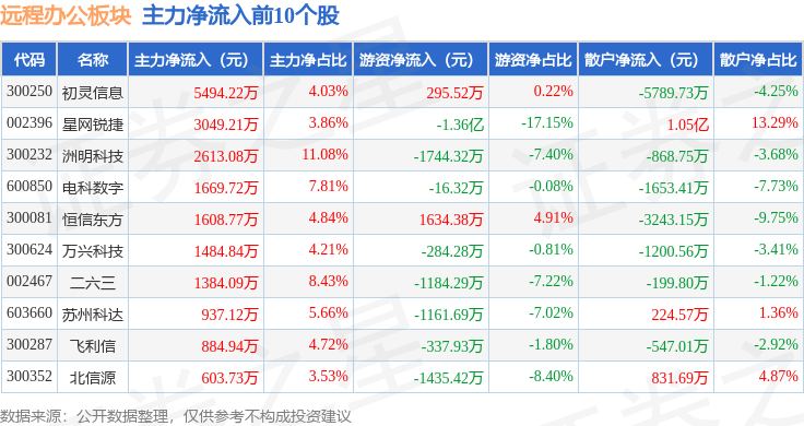 从资金流向上来看,当日远程办公板块主力资金净流出1.39亿元,游资资金净流出1.91亿元,散户资金净流入3.3亿元。远程办公板块个股资金流向见下表: