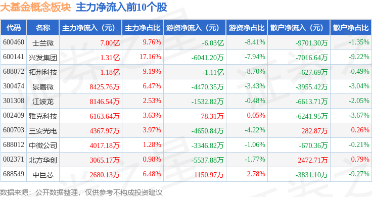 从资金流向上来看,当日大基金概念板块主力资金净流出5.66亿元,游资资金净流出8.75亿元,散户资金净流入14.41亿元。大基金概念板块个股资金流向见下表: