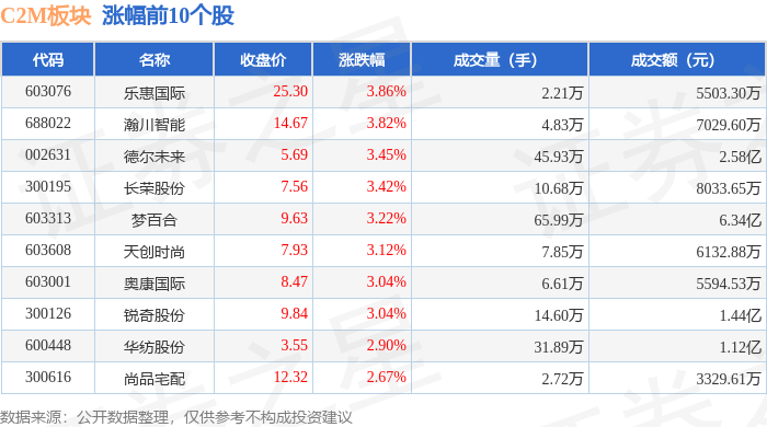 证券之星消息,10月20日C2M板块较上一交易日上涨0.17%,乐惠国际领涨。当日上证指数报收于3863.89,上涨0.63%。深证成指报收于12813.21,上涨0.98%。C2M板块个股涨跌见下表: