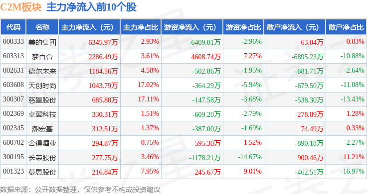 从资金流向上来看,当日C2M板块主力资金净流出1.41亿元,游资资金净流入2033.16万元,散户资金净流入1.21亿元。C2M板块个股资金流向见下表: