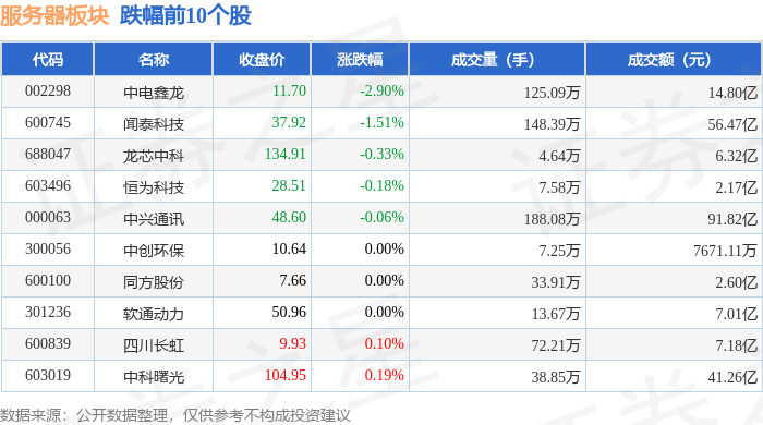 从资金流向上来看,当日服务器板块主力资金净流入3.2亿元,游资资金净流出4.01亿元,散户资金净流入8096.72万元。服务器板块个股资金流向见下表: