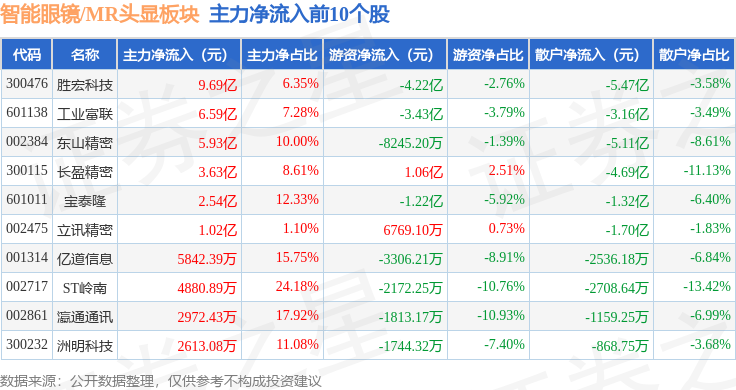 从资金流向上来看,当日智能眼镜/MR头显板块主力资金净流入15.92亿元,游资资金净流出10.55亿元,散户资金净流出5.37亿元。智能眼镜/MR头显板块个股资金流向见下表: