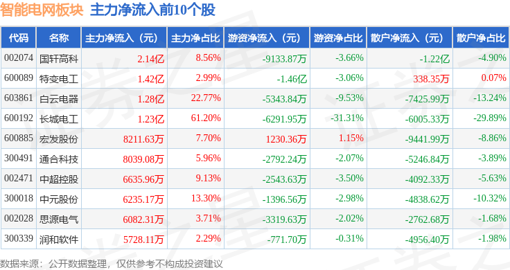 从资金流向上来看,当日智能电网板块主力资金净流出6.11亿元,游资资金净流出11.97亿元,散户资金净流入18.08亿元。智能电网板块个股资金流向见下表: