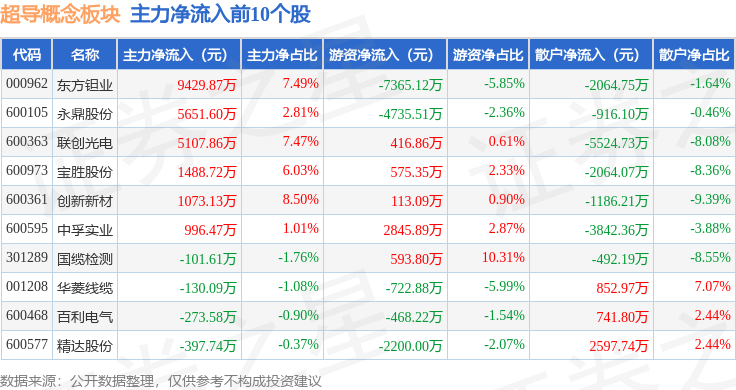 从资金流向上来看,当日超导概念板块主力资金净流出4.93亿元,游资资金净流入2938.15万元,散户资金净流入4.64亿元。超导概念板块个股资金流向见下表: