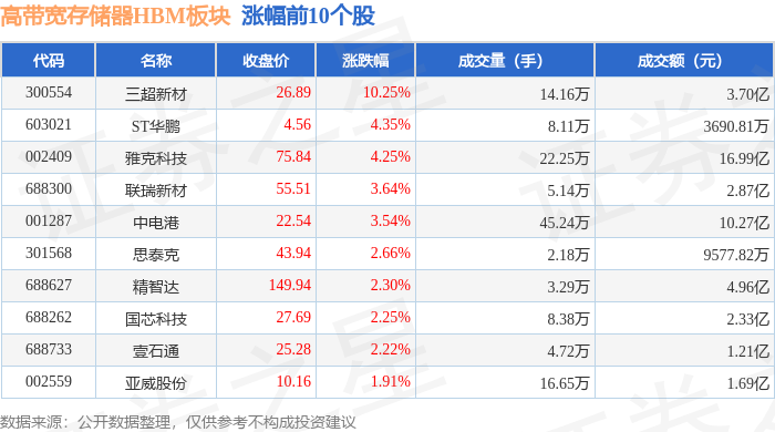 证券之星消息,10月20日高带宽存储器HBM板块较上一交易日上涨0.72%,三超新材领涨。当日上证指数报收于3863.89,上涨0.63%。深证成指报收于12813.21,上涨0.98%。高带宽存储器HBM板块个股涨跌见下表: