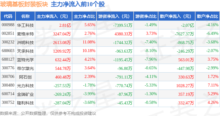 从资金流向上来看,当日玻璃基板封装板块主力资金净流出3.08亿元,游资资金净流入7245.3万元,散户资金净流入2.35亿元。玻璃基板封装板块个股资金流向见下表: