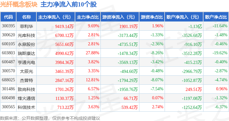 从资金流向上来看,当日光纤概念板块主力资金净流入1.49亿元,游资资金净流出2.82亿元,散户资金净流入1.32亿元。光纤概念板块个股资金流向见下表: