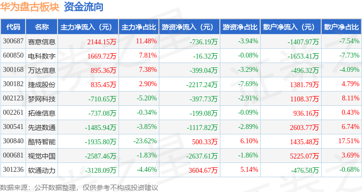 从资金流向上来看,当日华为盘古板块主力资金净流出5040.33万元,游资资金净流出3616.03万元,散户资金净流入8656.36万元。华为盘古板块个股资金流向见下表: