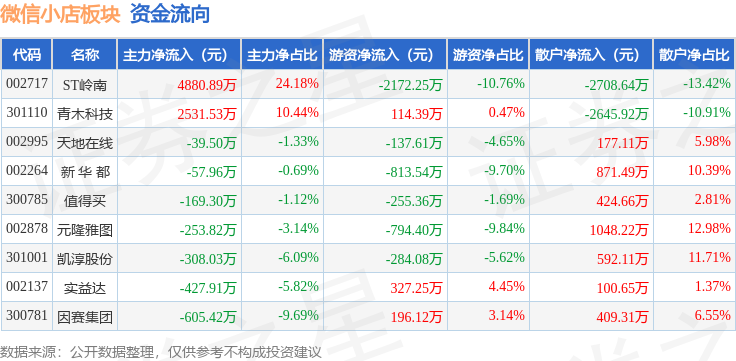 从资金流向上来看,当日微信小店板块主力资金净流入5550.49万元,游资资金净流出3819.49万元,散户资金净流出1731.0万元。微信小店板块个股资金流向见下表: