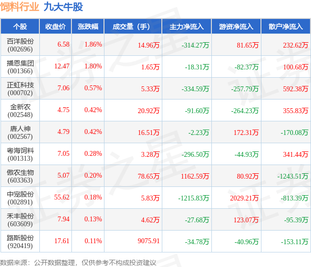 个股表现方面,饲料行业当日领涨股为百洋股份(002696),该股当日报收6.58,上涨1.86%,成交量14.96万,主力资金净流出314.27万元。播恩集团(001366)以上涨1.8%紧随其后,该股当日成交量1.65万,主力资金净流出18.31万元。除此之外,正虹科技(000702)、金新农(002548)、唐人神(002567)均进入当日牛股之列。具体个股列表见下表: