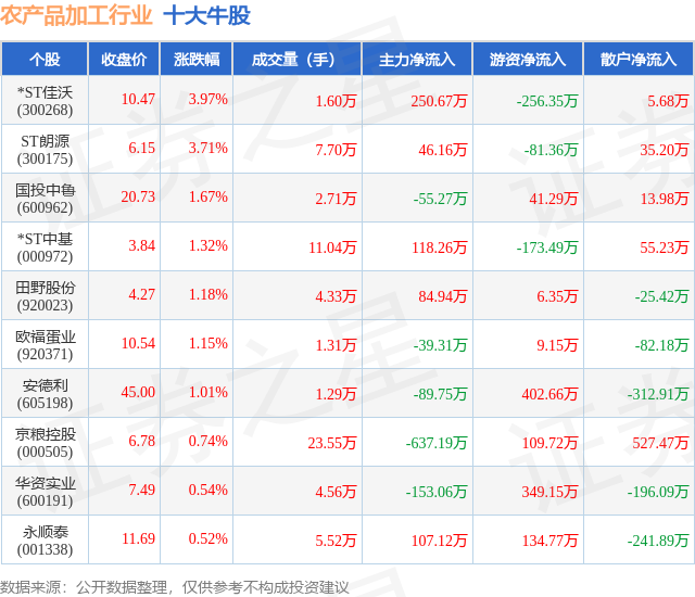 个股表现方面,农产品加工行业当日领涨股为*ST佳沃(300268),该股当日报收10.47,上涨3.97%,成交量1.6万,主力资金净流入250.67万元。ST朗源(300175)以上涨3.71%紧随其后,该股当日成交量7.7万,主力资金净流入46.16万元。除此之外,国投中鲁(600962)、*ST中基(000972)、田野股份(920023)均进入当日牛股之列。具体个股列表见下表: