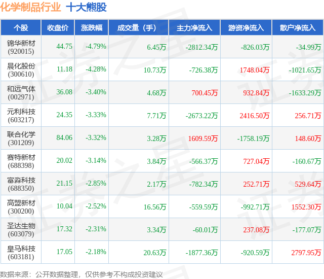 个股表现方面,化学制品行业当日领跌股为锦华新材(920015),该股当日报收44.75,下跌4.79%,成交量6.45万,主力资金净流出2812.34万元。晨化股份(300610)以下跌4.28%紧随其后,该股当日成交量10.73万,主力资金净流出726.38万元。除此之外,和远气体(002971)、元利科技(603217)、联合化学(301209)均进入当日熊股之列。具体个股列表见下表:
