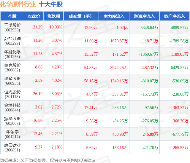 个股表现方面,化学原料行业当日领涨股为三孚股份(603938),该股当日报收21.29,上涨10.03%,成交量12.9万,主力资金净流入1.02亿元。苏盐井神(603299)以上涨5.07%紧随其后,该股当日成交量11.69万,主力资金净流入1670.87万元。除此之外,华融化学(301256)、奥克股份(300082)、华塑股份(600935)均进入当日牛股之列。具体个股列表见下表: