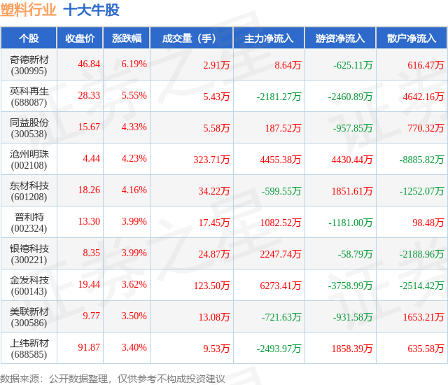 个股表现方面,塑料行业当日领涨股为奇德新材(300995),该股当日报收46.84,上涨6.19%,成交量2.91万,主力资金净流入8.64万元。英科再生(688087)以上涨5.55%紧随其后,该股当日成交量5.43万,主力资金净流出2181.27万元。除此之外,同益股份(300538)、沧州明珠(002108)、东材科技(601208)均进入当日牛股之列。具体个股列表见下表: