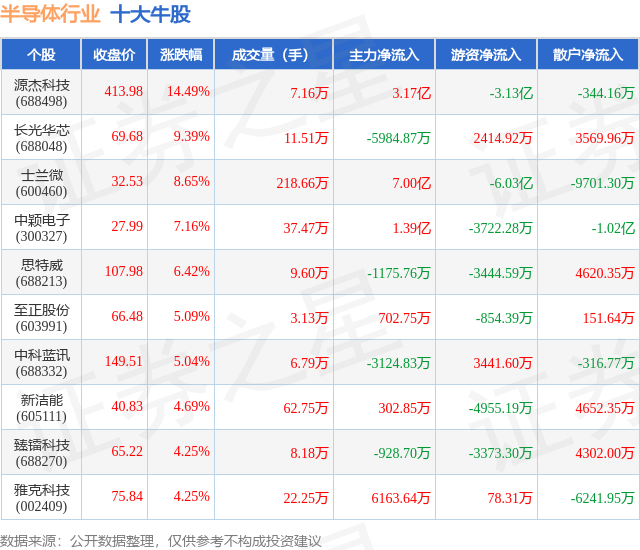 个股表现方面,半导体行业当日领涨股为源杰科技(688498),该股当日报收413.98,上涨14.49%,成交量7.16万,主力资金净流入3.17亿元。长光华芯(688048)以上涨9.39%紧随其后,该股当日成交量11.51万,主力资金净流出5984.87万元。除此之外,士兰微(600460)、中颖电子(300327)、思特威(688213)均进入当日牛股之列。具体个股列表见下表: