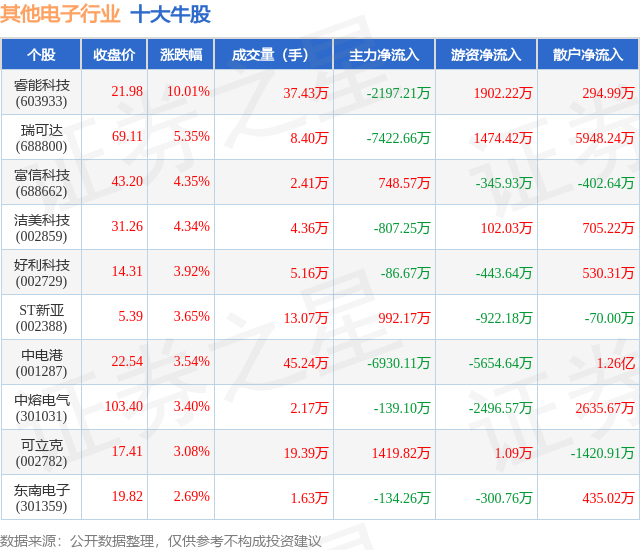 个股表现方面,其他电子行业当日领涨股为睿能科技(603933),该股当日报收21.98,上涨10.01%,成交量37.43万,主力资金净流出2197.21万元。瑞可达(688800)以上涨5.35%紧随其后,该股当日成交量8.4万,主力资金净流出7422.66万元。除此之外,富信科技(688662)、洁美科技(002859)、好利科技(002729)均进入当日牛股之列。具体个股列表见下表: