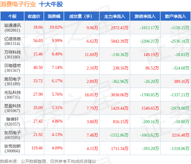 个股表现方面,消费电子行业当日领涨股为瀛通通讯(002861),该股当日报收18.66,上涨10.02%,成交量9.06万,主力资金净流入2972.43万元。亿道信息(001314)以上涨9.99%紧随其后,该股当日成交量6.62万,主力资金净流入5842.39万元。除此之外,万祥科技(301180)、贝隆精密(301567)、奥尼电子(301189)均进入当日牛股之列。具体个股列表见下表: