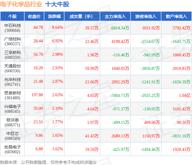 个股表现方面,电子化学品行业当日领涨股为中石科技(300684),该股当日报收44.78,上涨8.64%,成交量39.57万,主力资金净流出6814.34万元。广信材料(300537)以上涨6.92%紧随其后,该股当日成交量22.46万,主力资金净流入4198.42万元。除此之外,三孚新科(688359)、天通股份(600330)、光华科技(002741)均进入当日牛股之列。具体个股列表见下表: