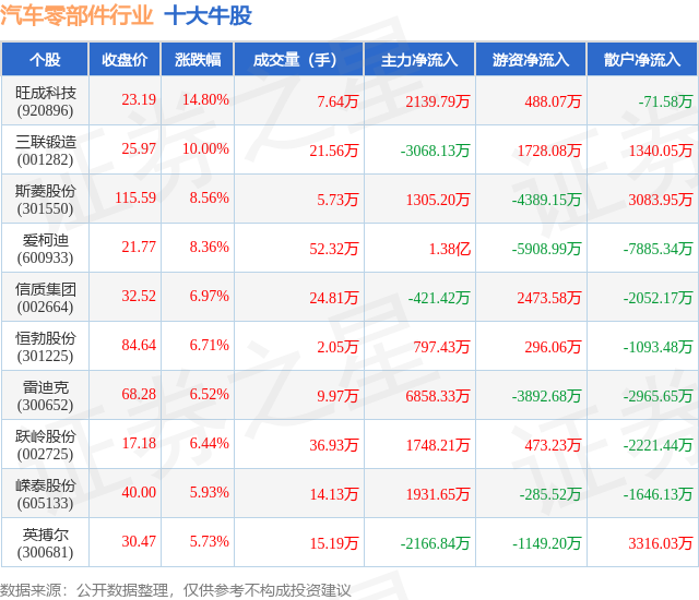个股表现方面,汽车零部件行业当日领涨股为旺成科技(920896),该股当日报收23.19,上涨14.8%,成交量7.64万,主力资金净流入2139.79万元。三联锻造(001282)以上涨10.0%紧随其后,该股当日成交量21.56万,主力资金净流出3068.13万元。除此之外,斯菱股份(301550)、爱柯迪(600933)、信质集团(002664)均进入当日牛股之列。具体个股列表见下表:
