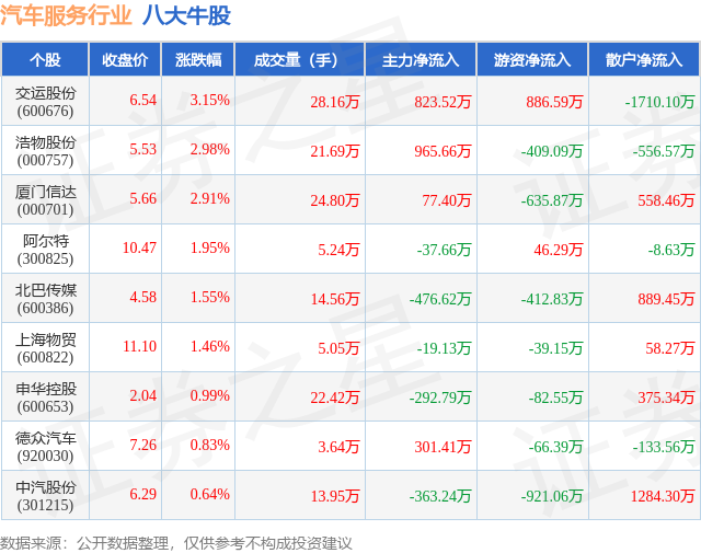 个股表现方面,汽车服务行业当日领涨股为交运股份(600676),该股当日报收6.54,上涨3.15%,成交量28.16万,主力资金净流入823.52万元。浩物股份(000757)以上涨2.98%紧随其后,该股当日成交量21.69万,主力资金净流入965.66万元。除此之外,厦门信达(000701)、阿尔特(300825)、北巴传媒(600386)均进入当日牛股之列。具体个股列表见下表: