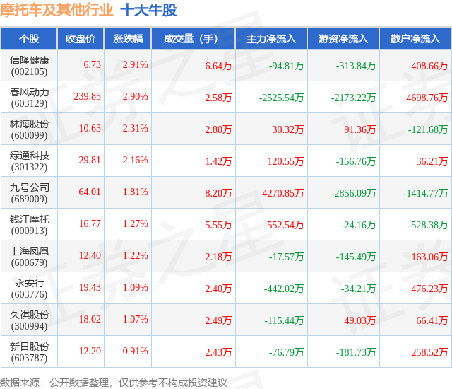个股表现方面,摩托车及其他行业当日领涨股为信隆健康(002105),该股当日报收6.73,上涨2.91%,成交量6.64万,主力资金净流出94.81万元。春风动力(603129)以上涨2.9%紧随其后,该股当日成交量2.58万,主力资金净流出2525.54万元。除此之外,林海股份(600099)、绿通科技(301322)、九号公司(689009)均进入当日牛股之列。具体个股列表见下表: